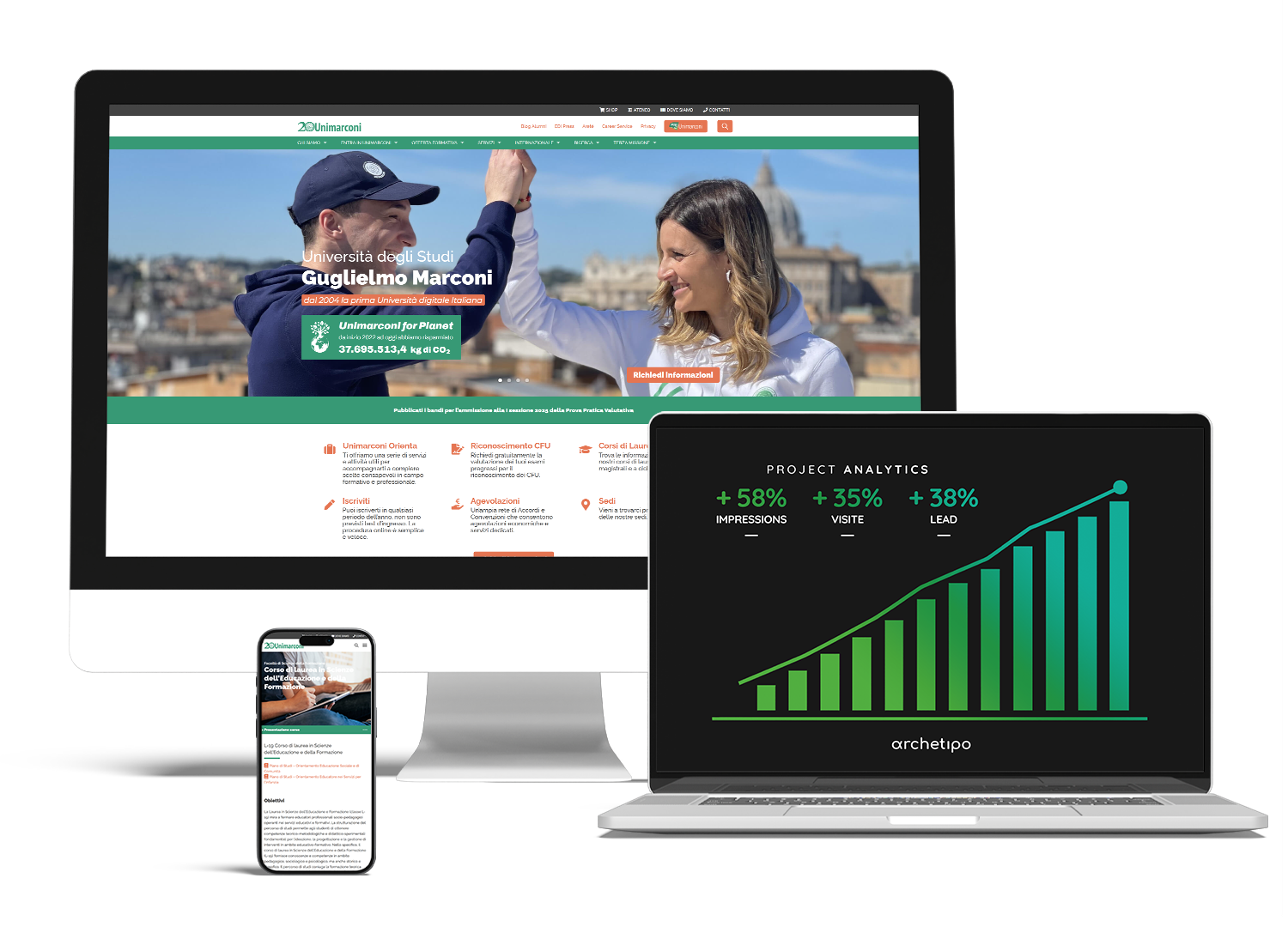Nel 2021, Archetipo affianca UniMarconi nella strategia di acquisizione digitale, ottimizzando la migrazione SEO del nuovo portale, rivedendo i contenuti dell’offerta formativa e gestendo le campagne ADV su Google, Facebook e LinkedIn.